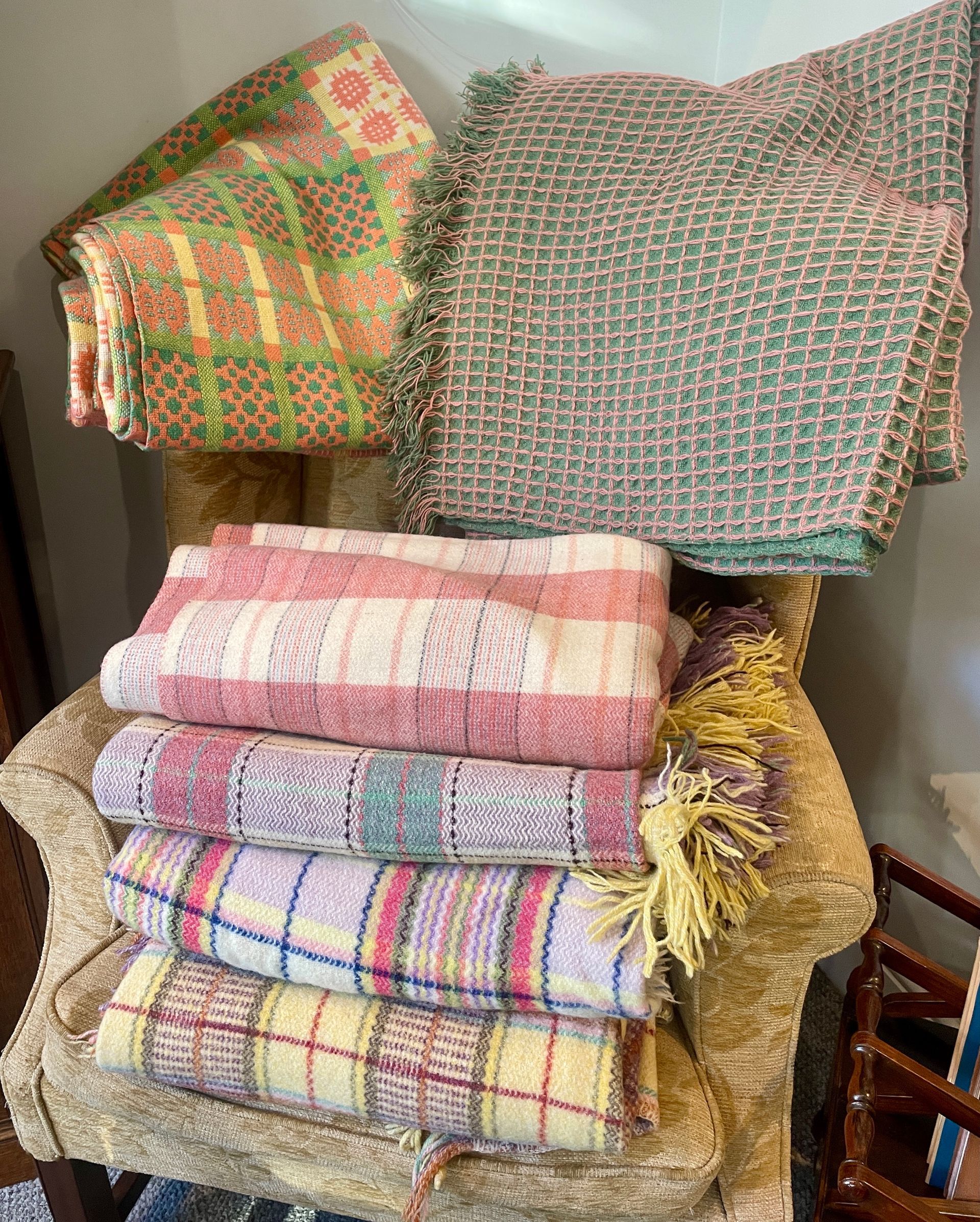 No two days are ever the same in this business. The pressure to keep the shop full of new and interesting items means I’m always hunting down fresh stock - following up leads, visiting trusted contacts and making new ones. This takes me far and wide and this week I’ve been travelling through Wales where I was able to buy a fabulous collection of Welsh Blankets. Sheep farming and the wool industry has shaped Wales’s economy for centuries and the production of blankets can be traced back to the 12th Century! Originally made at home on a small loom, the industry grew in the 18th and 19th centuries when commercial mills were established. A particular feature of Welsh blankets is the woven double cloth technique which produces a pattern on both sides, making the blankets reversible. Each region and indeed each mill had their own distinctive patterns, some of which were carefully passed down through generations. For example, the Caernarfon pattern is one of the most iconic and traditional with its geometric design featuring a series of interlocking portcullises, usually created with two to four colours. Plaid Blankets were a popular design and colours became more bold over time with the introduction of synthetic dyes. Traditionally, a pair of Welsh blankets were given as a wedding gift and they were believed to capture the feeling of ‘Hiraeth’, a Welsh word for homesickness and longing for home. Queen Victoria was even gifted a Welsh blanket on her wedding day in 1840! At its peak there were more than 300 mills in Wales producing Welsh blankets but the industry almost disappeared in the 20th century and now just a handful of mills remain. However they are continuing this important tradition and the Welsh blanket maintains its cultural significance as well as being a very collectable, usable and decorative item.